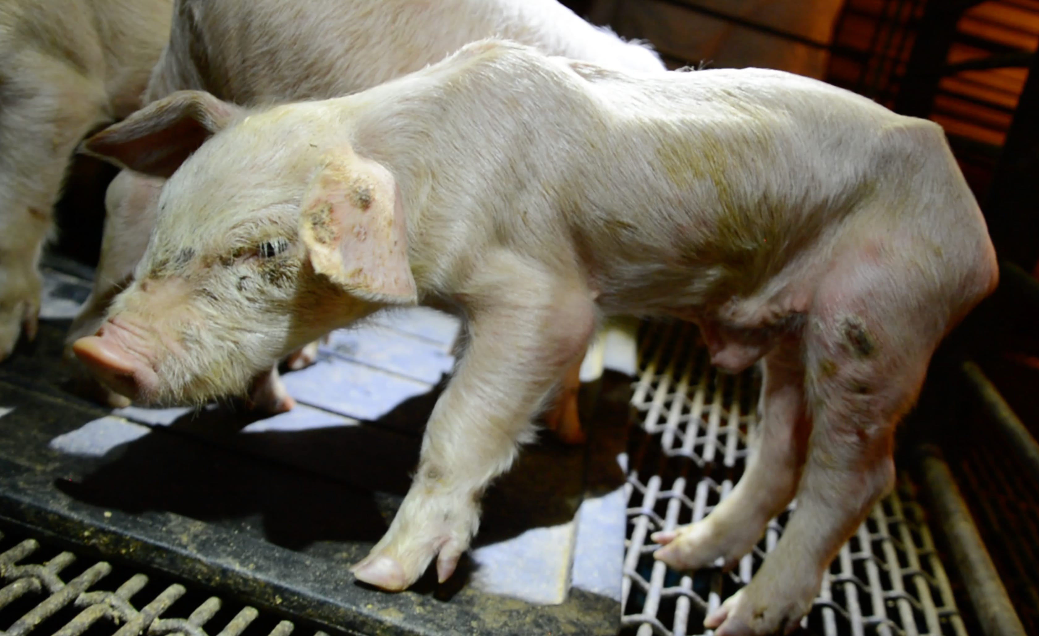 One of the first piglets we saw was literally caught in this system. In the crowded pens of the Farmer John nursery, where the animals were small enough to fit through various gaps in the cage bars, a baby animal was hanging from the edge of the pen. She appeared dead from starvation. We could see her bones protruding through her skin, and she was about half the size of the other piglets. But as we approached, she moved; she was not dead but rather smashed and trapped in the machinery of the factory farm. That moment was caught on camera, and I am publishing it for the first time today.