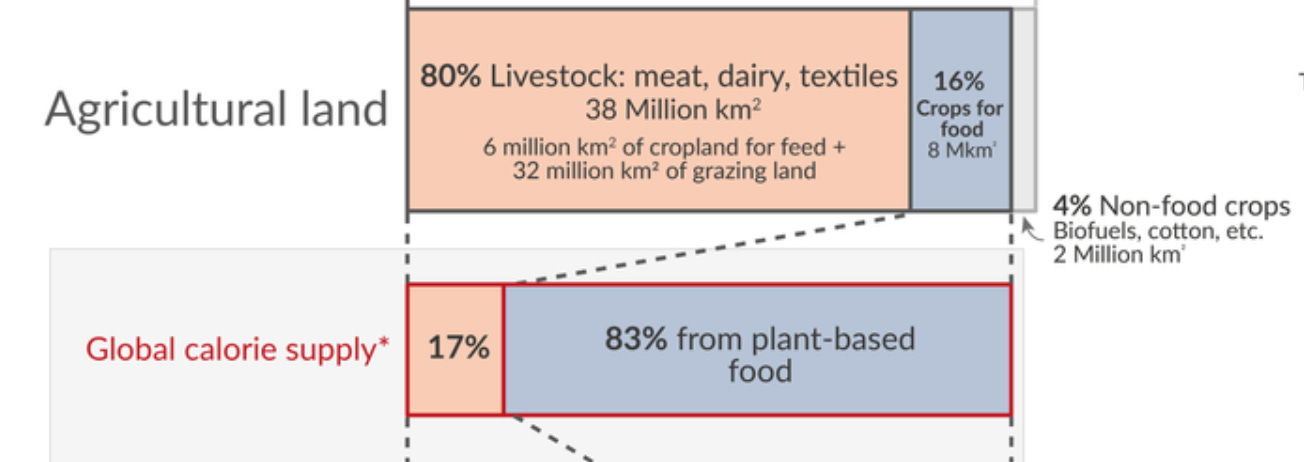 But this is geographically impossible. We are already using 80% of all agricultural land on animals. If we multiplied that space by 100x, we would need 8000% of the land on Earth, i.e. 80 Earths. We do not have 80 Earths. We have one.