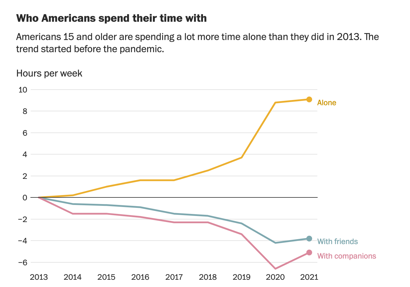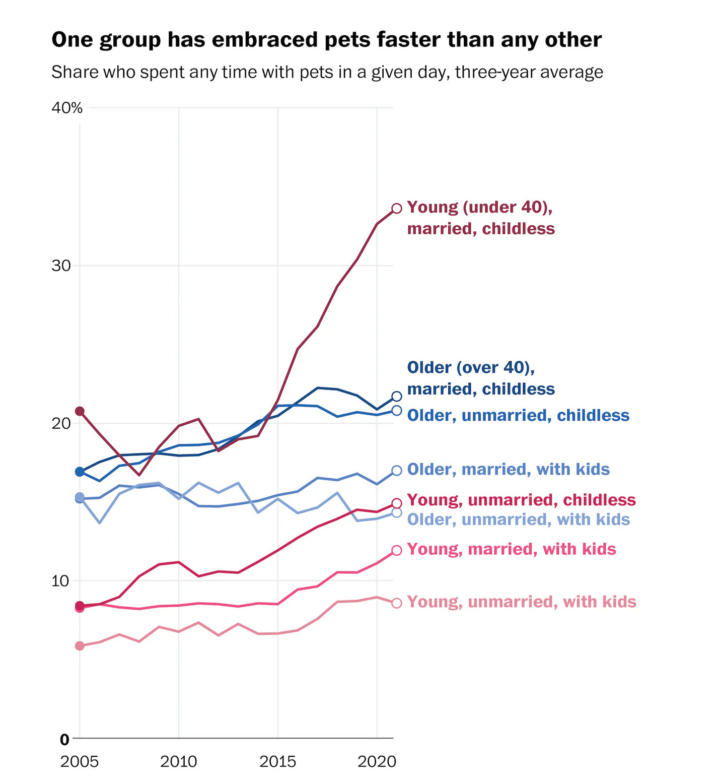 There is, however, one data point pushing back against this trend: the time that Americans spend with their companion animals. In 2021, the amount of time the average American spent with a non-human animal hit a record high. Perhaps most interesting, however, is who is spending the most time with animals: childless Americans under the age of 40.