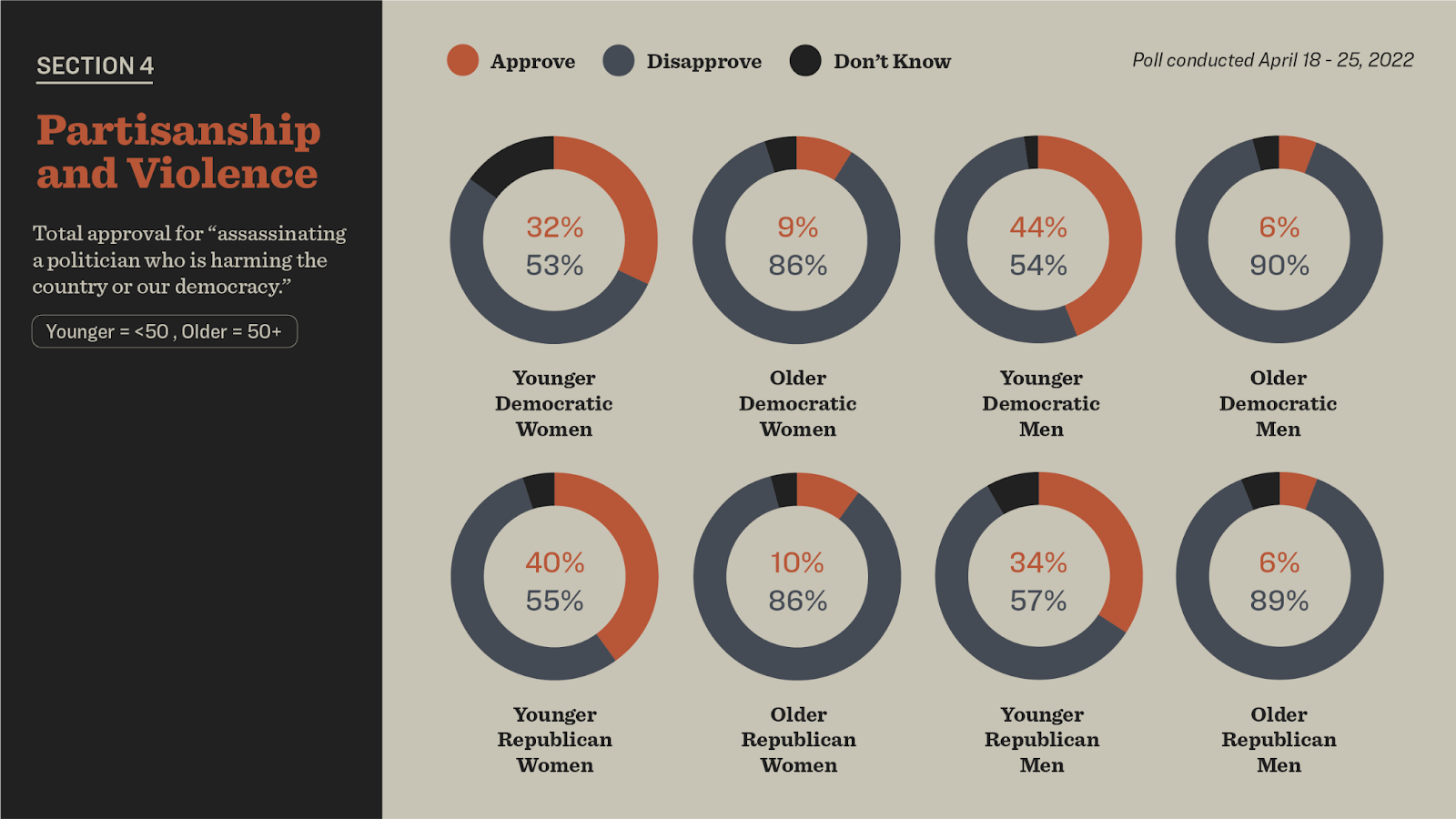Normalizing aggression. In June 2022, the Southern Poverty Law Center, one of the nation’s most renowned civil rights organizations, published a poll that examined the extreme views of the American right, including the so-called “replacement theory” that motivated a mass shooter in Buffalo. However, there was one shocking finding of this poll that the SPLC failed to highlight: young Americans of all parties were increasingly open to the use of violence. Indeed, young Democratic men were the most supportive of assassination as a tactic, with 44% indicating they would approve of murdering a political opponent who was “harming the country.”