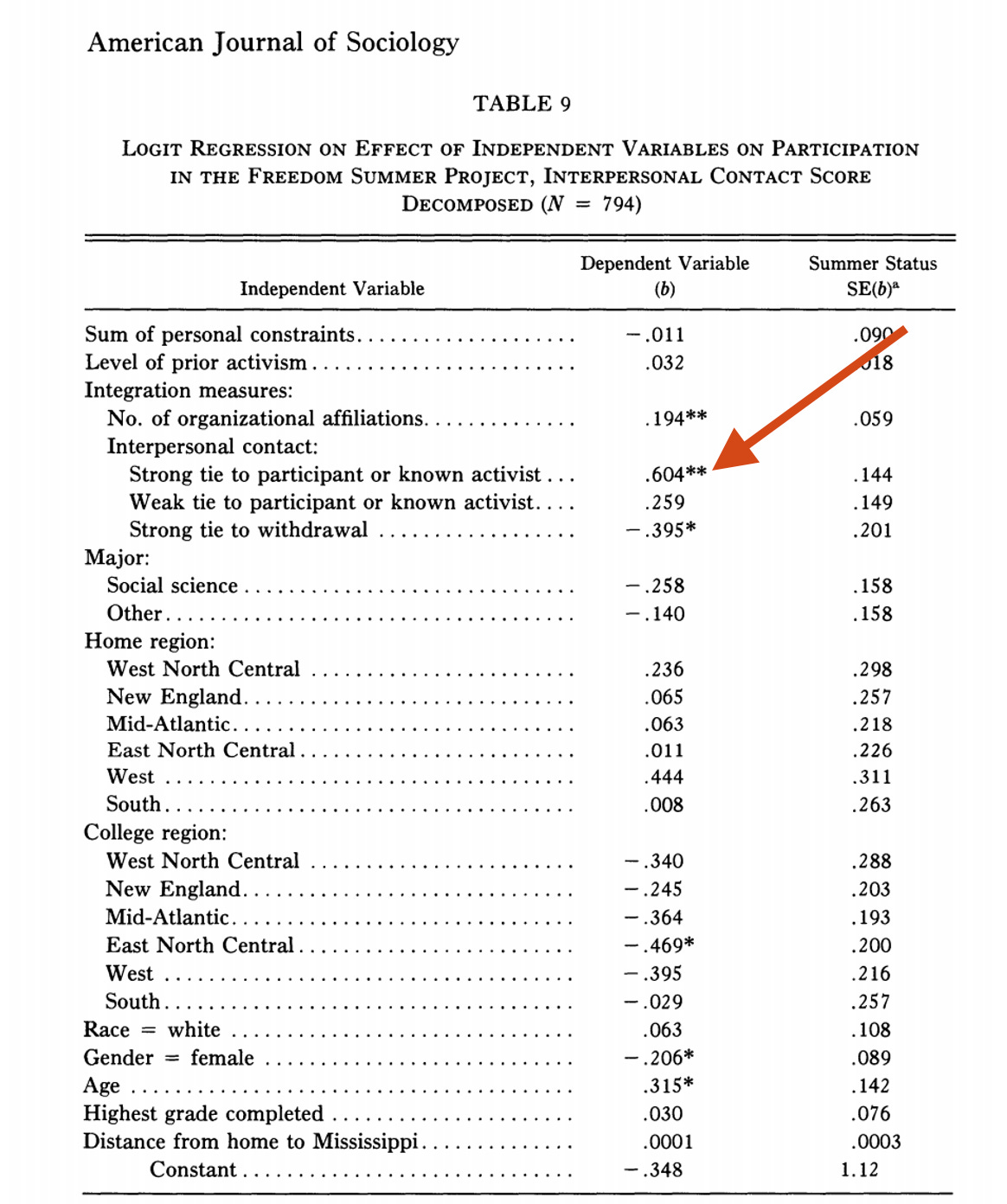 Specifically, what Doug discovered, while poring through applications to the legendary Freedom Summer campaign of 1964, is that applicants who had a strong tie to a fellow attendee were about 60.4% more likely to follow through and join the movement to register Black voters in Mississippi. In contrast, applicants who had a strong tie to someone who withdrew from the movement were 39.5% more likely to withdraw themselves.