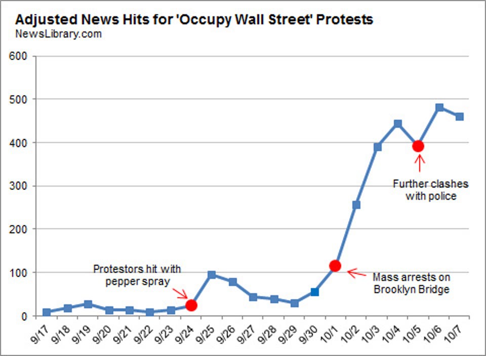 During the Occupy Wall Street movement of 2011, data scientist Nate Silver published this in The New York Times. It showed how clashes with the authorities, leading to mass arrests, were driving media coverage to remarkable heights. For years, I had been trying and failing to get anyone — even a student newspaper — to pay attention to animal rights. And Silver’s chart seemed to offer a simple solution: