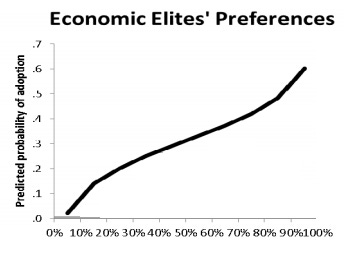 The second chart shows the likelihood that a particular action is taken by politicians, as support from the economic elite (defined by people in the top 10% of the income distribution) grows. The steep curve shows that politicians are highly motivated to take action, when rich people want it to happen.