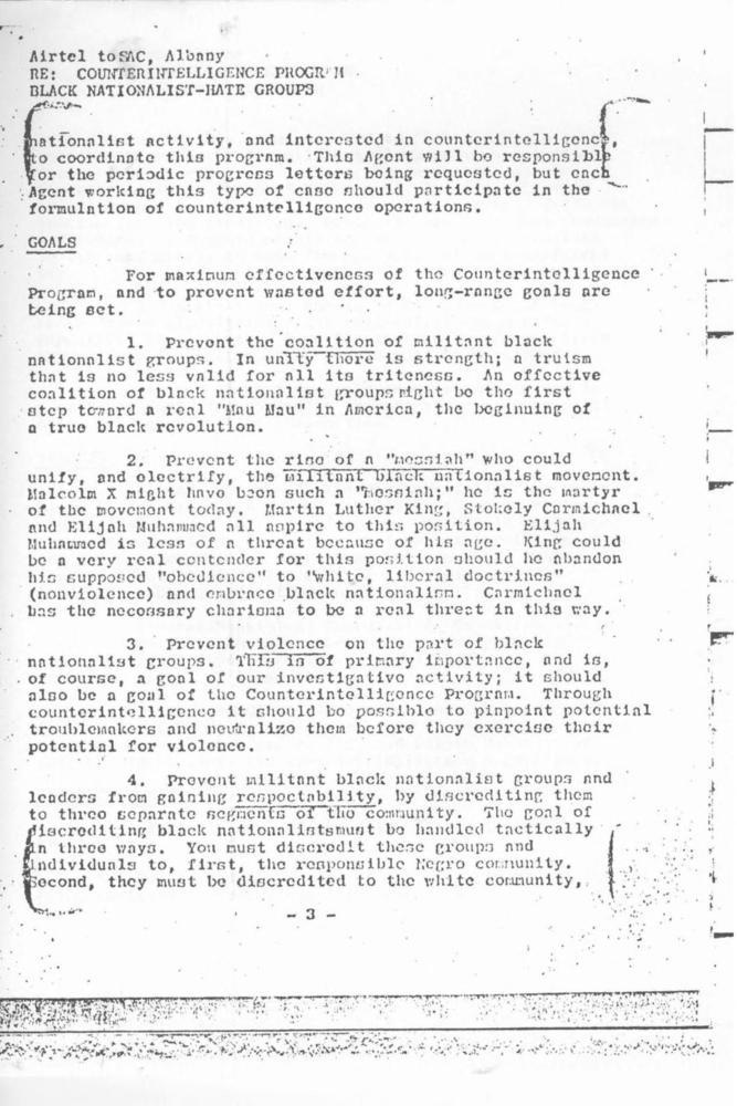 The goals of COINTELPRO were straightforward. Undermine unity in the movement, and attack its leadership. “In unity there is strength,” the FBI wrote at the time. The rise of leaders who could “unify, and electrify” a movement should therefore be stopped. Left unspoken was how any of this had to do with, well, law enforcement.