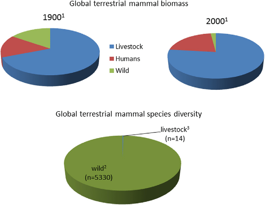 The inevitable result of domination as a way of life, however, was a planet filled with exploitation and suffering. And the most prominent land-based vertebrate species on earth, human beings, has risen to the top of that hierarchy, based in large part on what we eat. Consider the biomass of all the living beings on earth.
