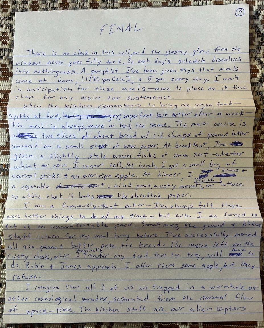 When the kitchen remembers to bring me vegan food — spotty at first, and imperfect, but better after a week — the meal is always more or less the same. The main course is two slices of wheat bread with one or two clumps of peanut butter smeared on a small sheet of wax paper. At breakfast, I’m given a slightly stale brown flake of some sort — whether wheat or corn, I cannot tell. At lunch, I get a small bag of carrot sticks and an over-ripe apple. At dinner, I receive beans and a vegetable: boiled peas, mushy carrots, or lettuce so white that it looks like shredded paper.