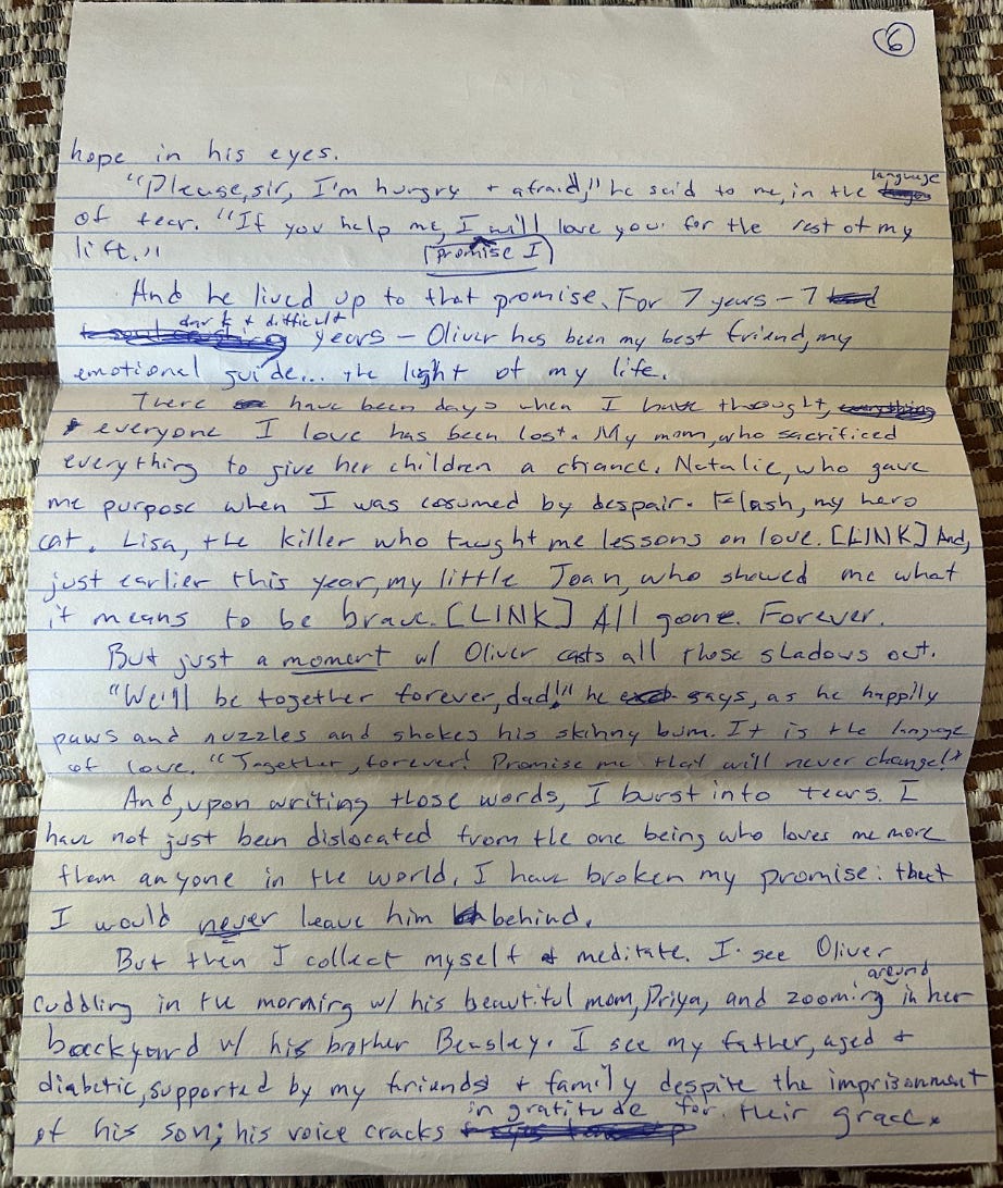 But then I collect myself and meditate. I see Oliver cuddling in the morning with his beautiful mom, Priya, and zooming around in her backyard with his brother, Beasley. I see my father, aged and diabetic, supported by my friends and family despite the imprisonment of his son; his voice cracks in gratitude for their grace.