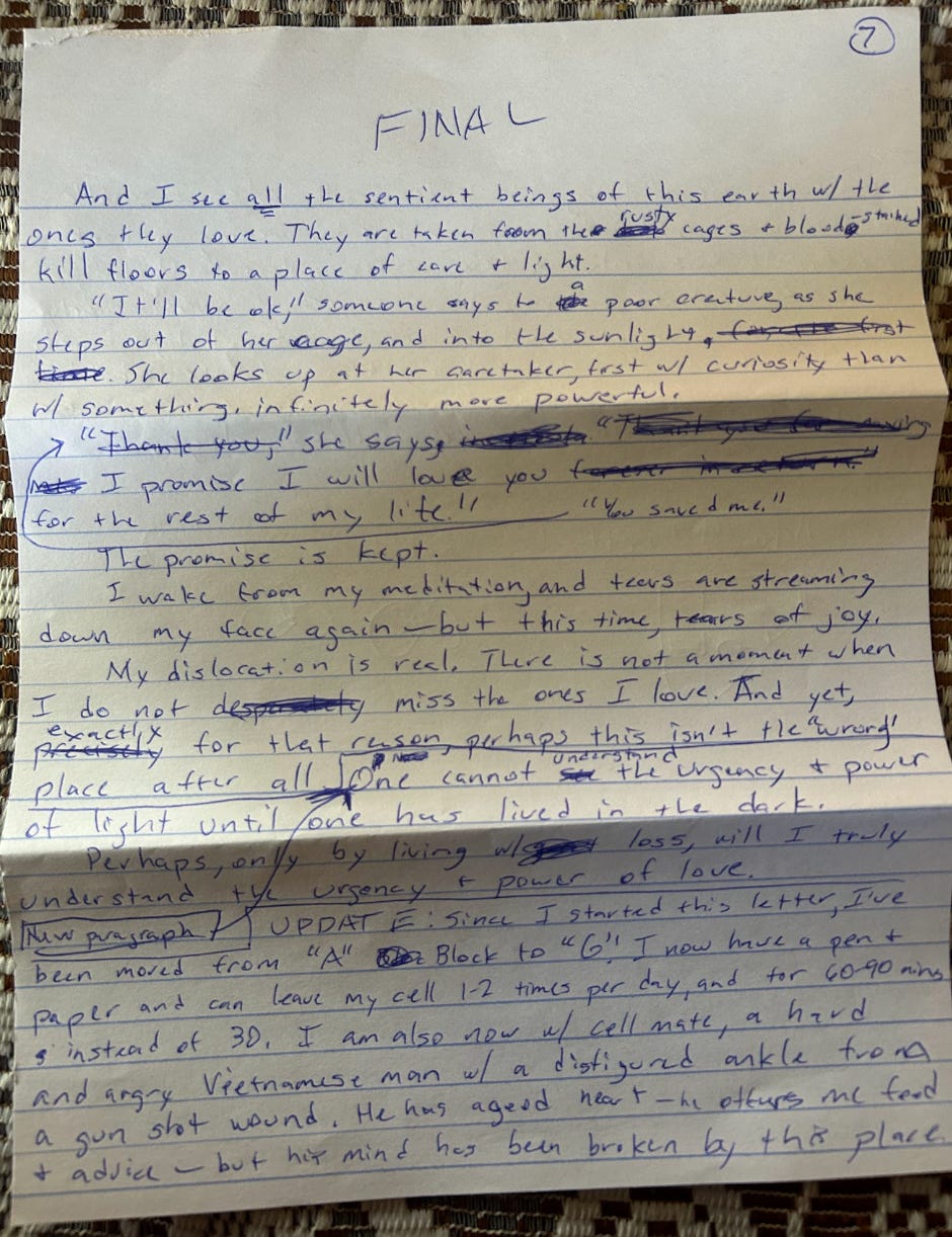 UPDATE: Since I started this letter, I’ve been moved from “A” Block to “G.” I now have a pen and paper and can leave my cell 1 to 2 times per day, and for 60 to 90 minutes instead of 30. I am also now with a cellmate, a hard and angry Vietnamese man with a disfigured ankle from a gunshot wound. He has a good heart — he offers me food and advice — but his mind has been broken by this place.