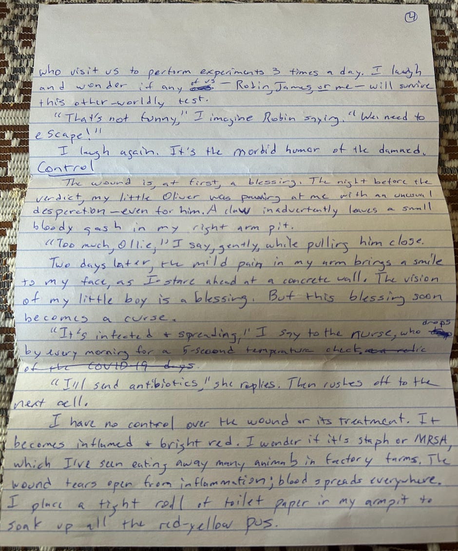 I have no control over the wound or its treatment. It becomes inflamed and bright red. I wonder if it’s staph or MRSA, which I’ve seen eating away many animals in factory farms. The wound tears open from inflammation; blood spreads everywhere. I place a tight roll of toilet paper in my armpit to soak up all the red-yellow pus.