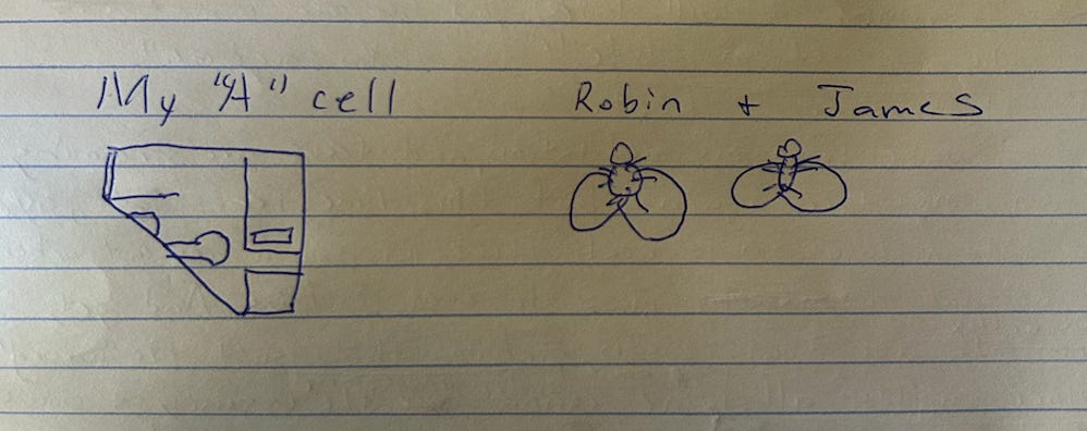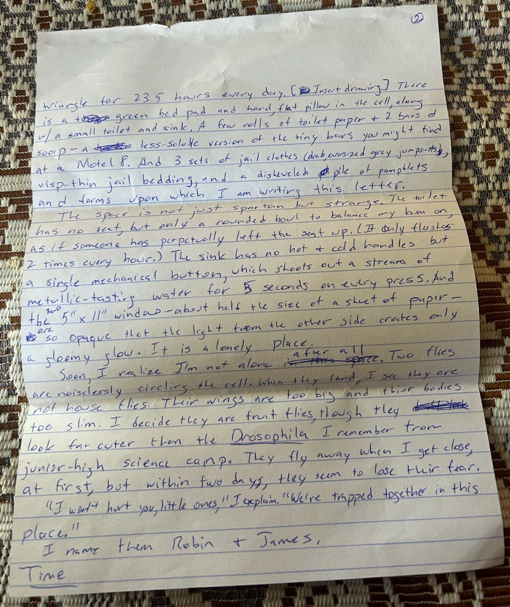 Soon, I realize I’m not alone after all. Two flies are noiselessly circling the cell. When they land, I see they are not house flies. Their wings are too big and their bodies too slim. I decide they are fruit flies, though they look far cuter than the Drosophila I remember from junior high science camp. They fly away when I get close, at first, but within two days, they seem to lose their fear.