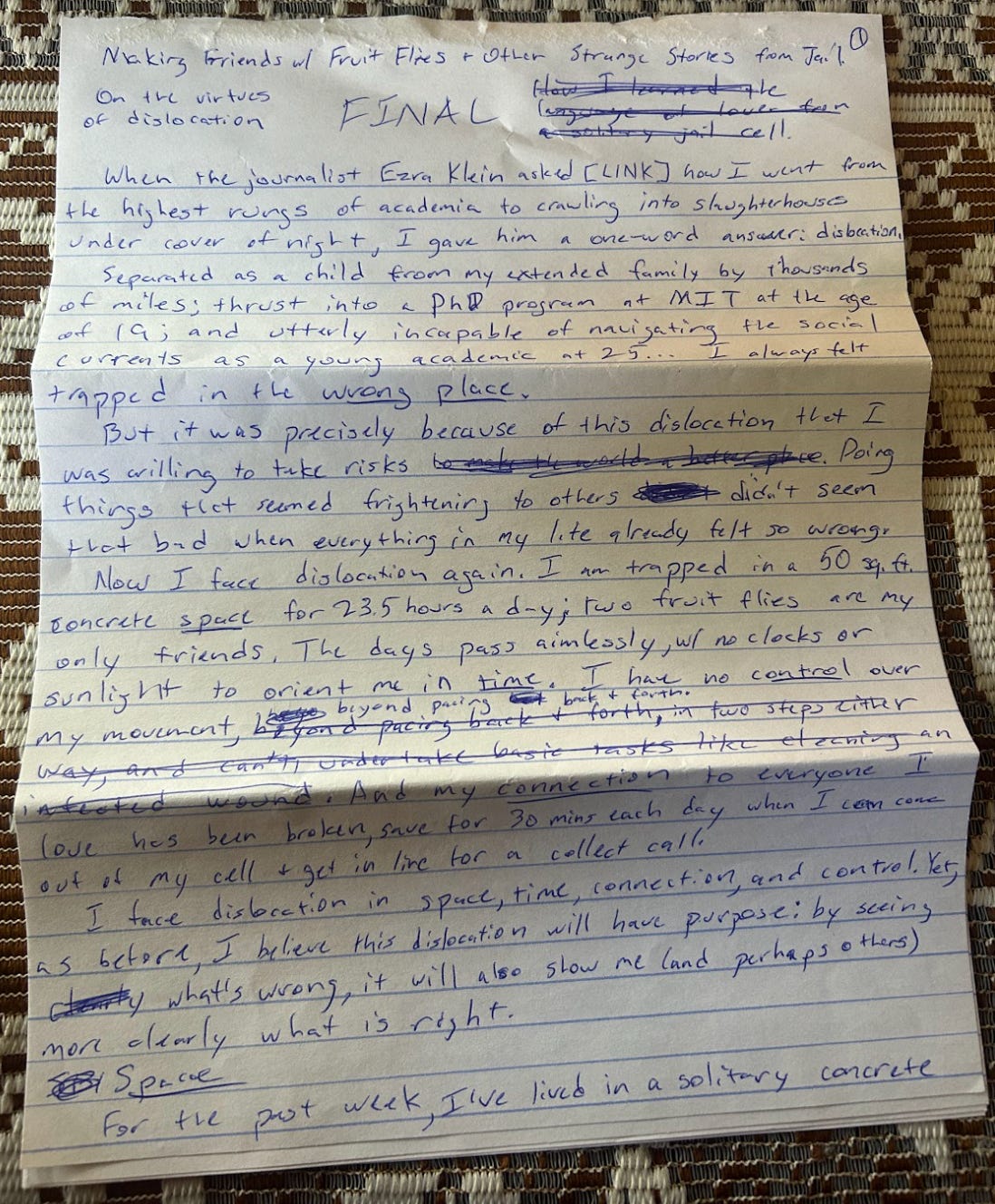 Now I face dislocation again. I am trapped in a 50 square foot concrete space for 23.5 hours a day; two fruit flies are my only friends. The days pass aimlessly, with no clocks or sunlight to orient me in time. I have no control over my movement, beyond pacing back and forth. And my connection to everyone I love has been broken, save for 30 minutes each day when I can come out of my cell and get in line for a collect call.