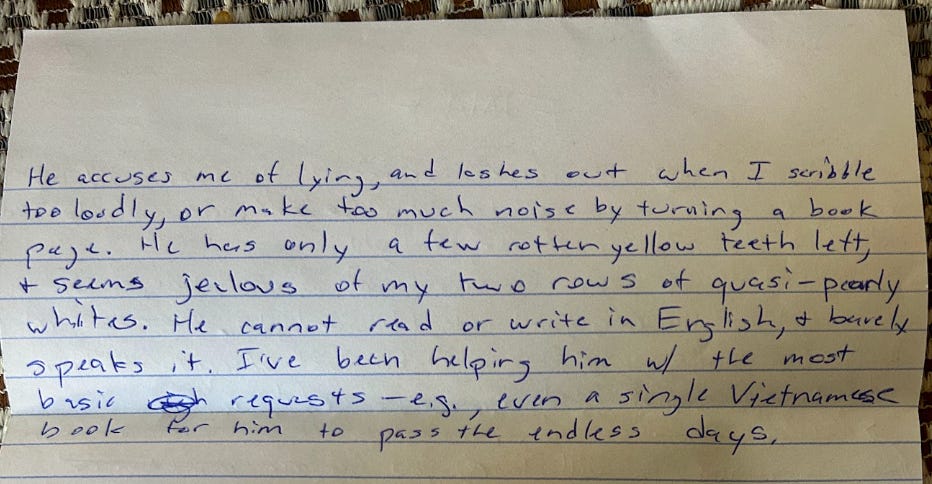 He accuses me of lying, and lashes out when I scribble too loudly, or make too much noise by turning a book page. He has only a few rotten yellow teeth left, and seems jealous of my two rows of quasi-pearly whites. He cannot read or write in English, and barely speaks it. I’ve been helping him with the most basic requests — e.g., even a single Vietnamese book for him to pass the endless days.