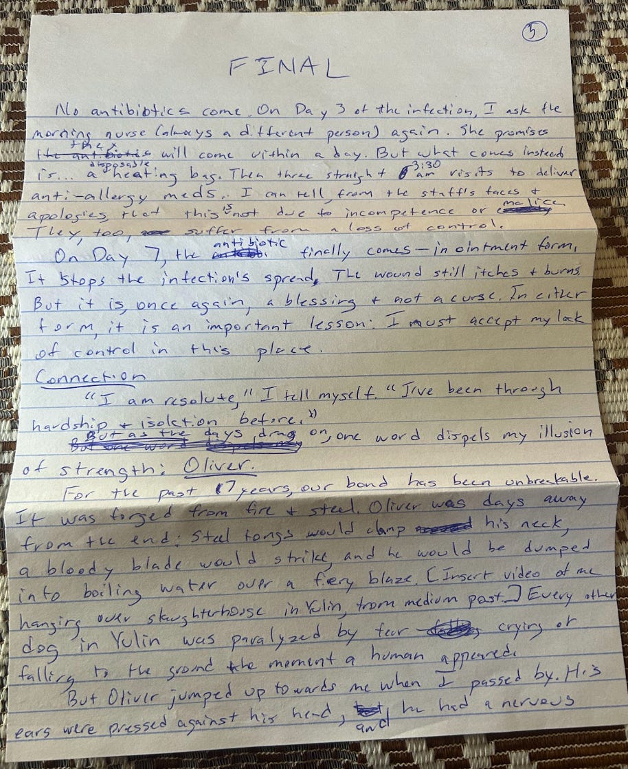 No antibiotics come. On day three of the infection, I ask the morning nurse (always a different person) again. She promises they will come within a day. But what comes instead is… a disposable heating bag. Then three straight 3:30am visits to deliver anti-allergy meds. I can tell from the staff’s faces and apologies that this is not due to incompetence or malice. They, too, suffer from a loss of control.