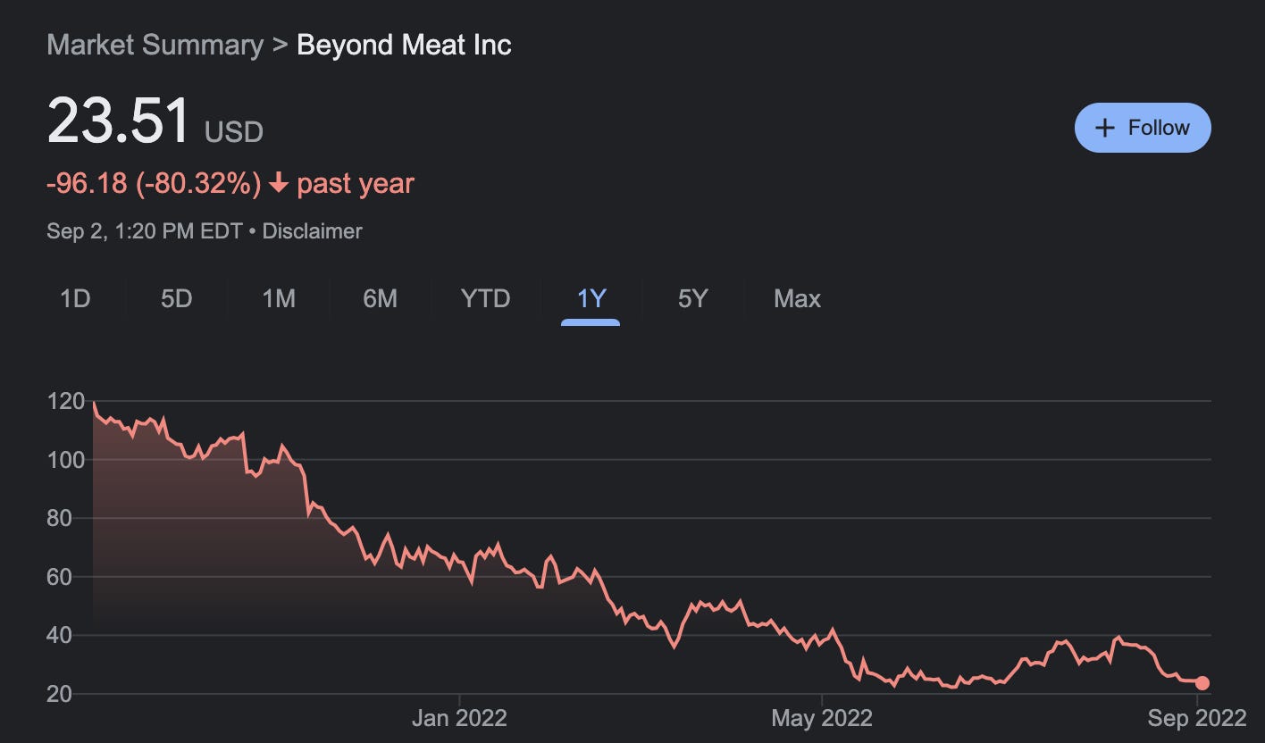 There’s a market crash that not many people have been talking about: plant-based foods. The share price of two of the most prominent plant-based foods, Oatly and Beyond, have shed a shocking 82% and 80% of their value in the last year. Both stocks are also at a lower price than their initial public offering – a mark of shame that often predicts a company’s death.