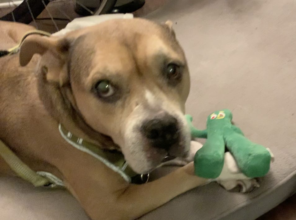 Lisa was an incredibly active dog for 12 years, running everywhere and biting and chewing up everything — often within minutes of finding it. But in her last years, especially after she was spayed, she slowed down a lot. She did not play with toys. She did not scamper around the home. And she definitely did not run and jump into my lap, the way she did when she was a kid. (I can’t attribute this entirely to the hysterectomy. But I’ve read some evidence suggesting that the surgery can cause behavioral change, and gaining weight, due to changes in a dog’s hormones. Call me out on this if I’m wrong!)