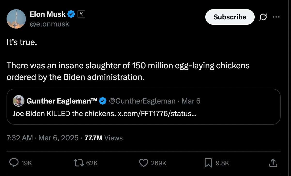 In March 2025, Elon Musk made a curious allegation against former President Joe Biden. “There was an insane slaughter of 150 million egg-laying chickens ordered by the Biden administration,” he exclaimed. And 269,000 people liked his tweet. Musk was referring to the mass slaughter of hens, through the most grotesque methods imaginable, due to outbreaks of bird flu around the country. Biden was alleged to have done the killing due to the $1 billion in subsidies given by his government to agricultural interests to roast animals alive. It was one of the few instances where Musk and I were on the same page.
