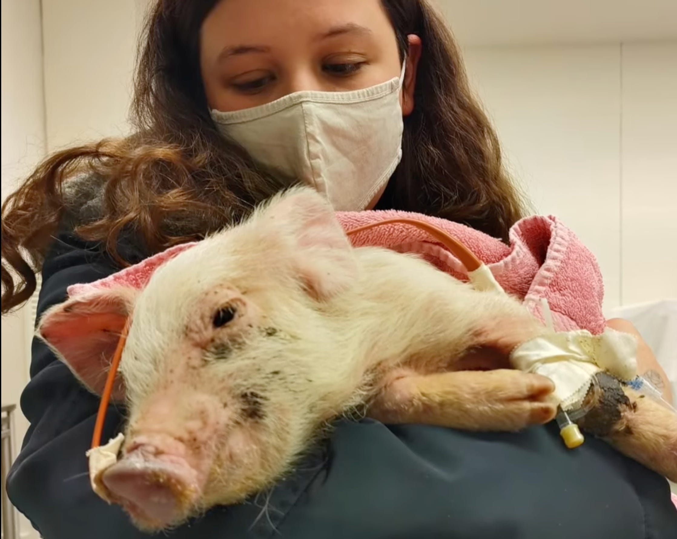It was about 0 degrees Fahrenheit, the ground covered in snow, and the piglet was shivering and covered in blood as his tiny body rose and fell with each breath. The activists unburied him from beneath the other bodies, bundled him up and rushed him to a vet, unsure if he would survive. Charlie, as he was later named, was estimated to be three weeks old, weighed seven pounds, and had several health problems and injuries, including severe hypothermia and a broken jaw and rib.