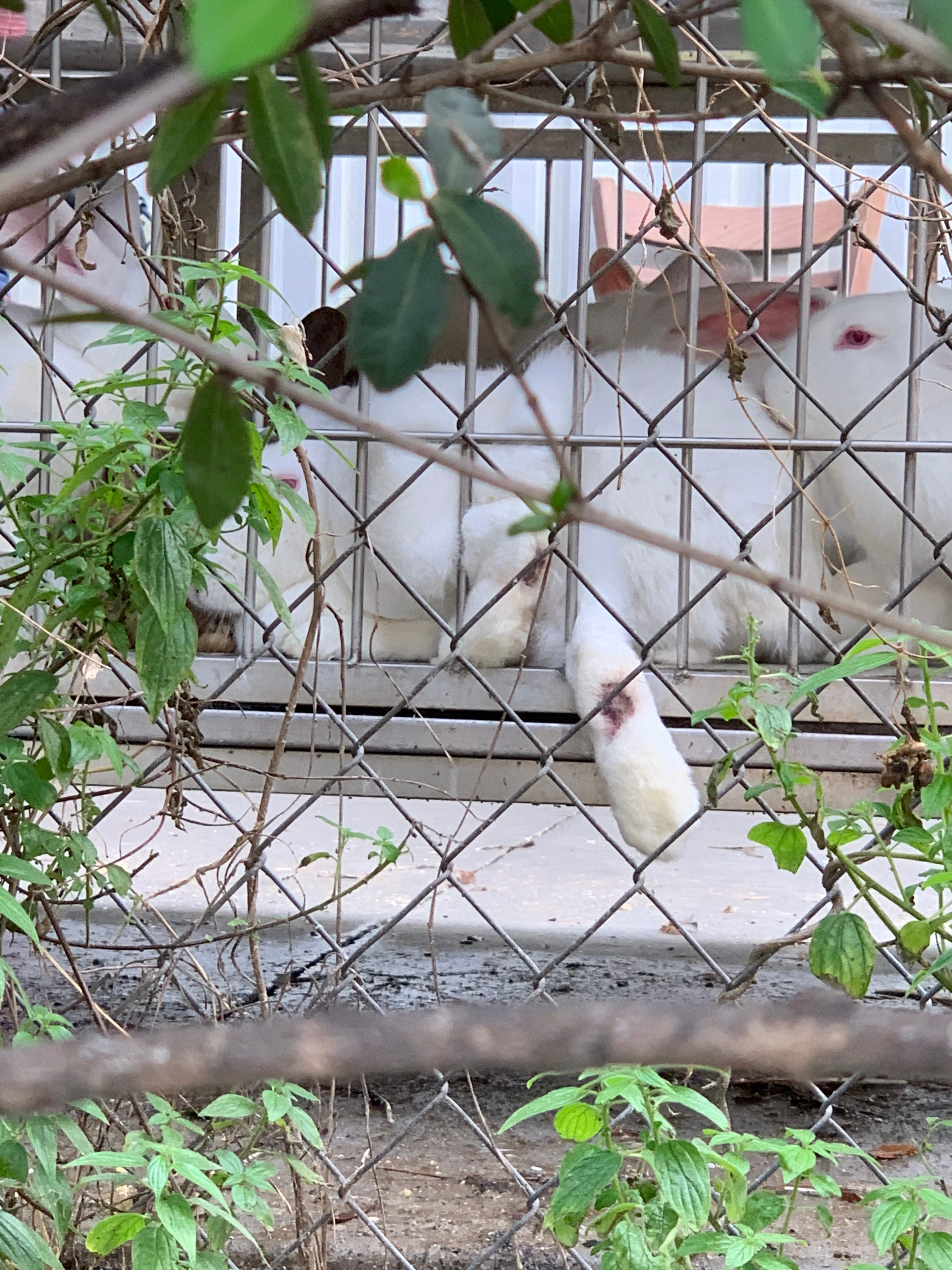There was the bunny who was pushing himself back up against the edge of the cage, pressing so far away from the opening where his sisters and brothers were being taken and killed, that his legs were protruding through the wire holes. I could see in the abrasions on his hind legs that this was a struggle that had already taken its toll.
