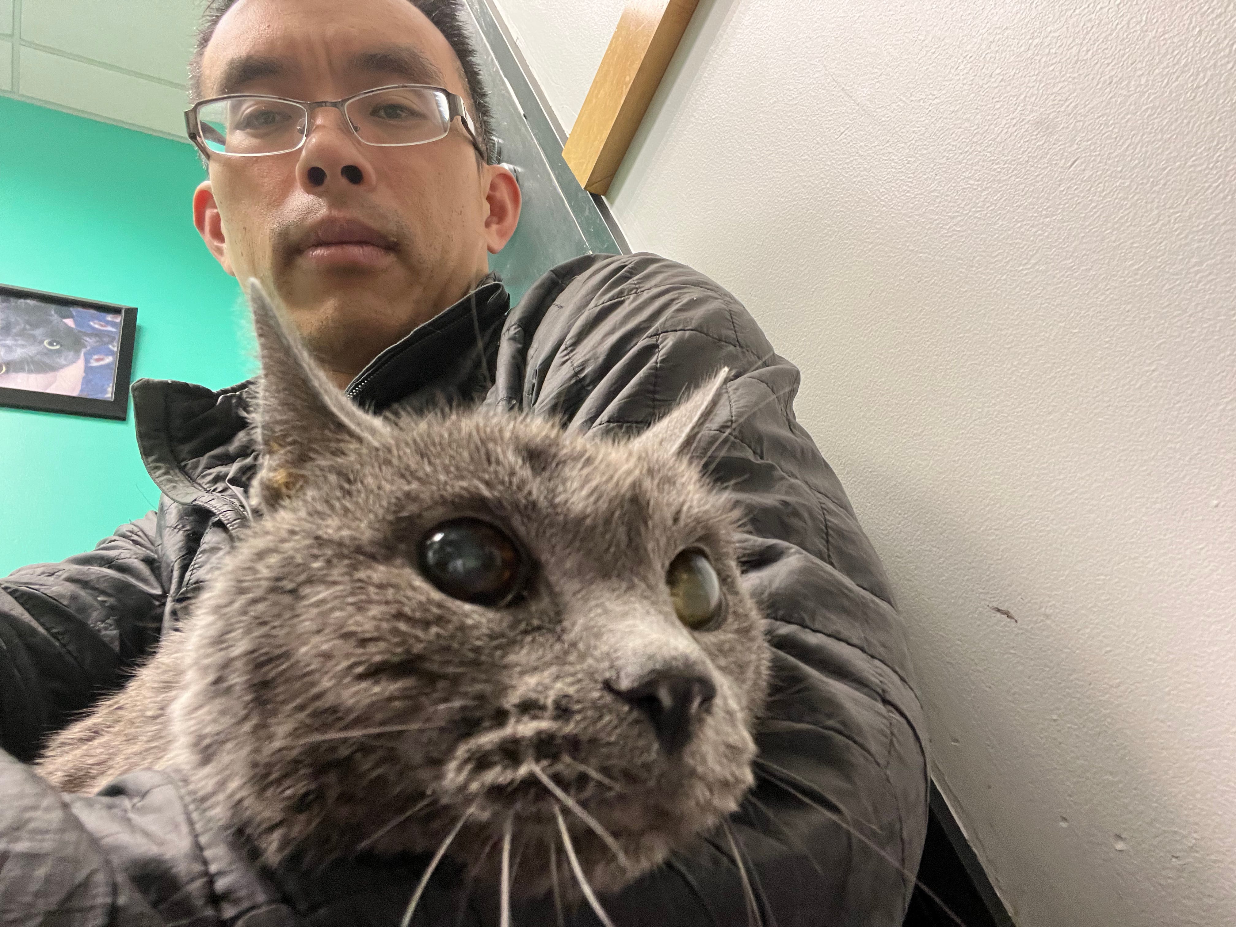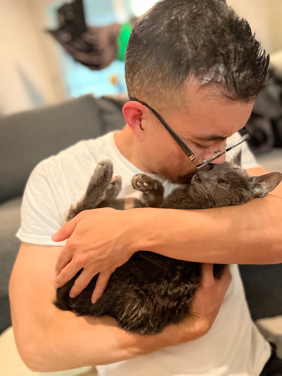 But the scariest animal of them all was yet to come: me. I had never taken in a cat before. I used to say to everyone who would talk to me — which was not many — that I hated cats. Cats were like the cool kids at school, and I was definitely not cool! I was an angry young man, struggling to make it through law school and bitter towards the world, and 100+ times larger than this tiny kitten smaller than the palm of my hand. Surely, this kitten would see me for who I was: a cat-hating behemoth. Surely, he would be afraid.