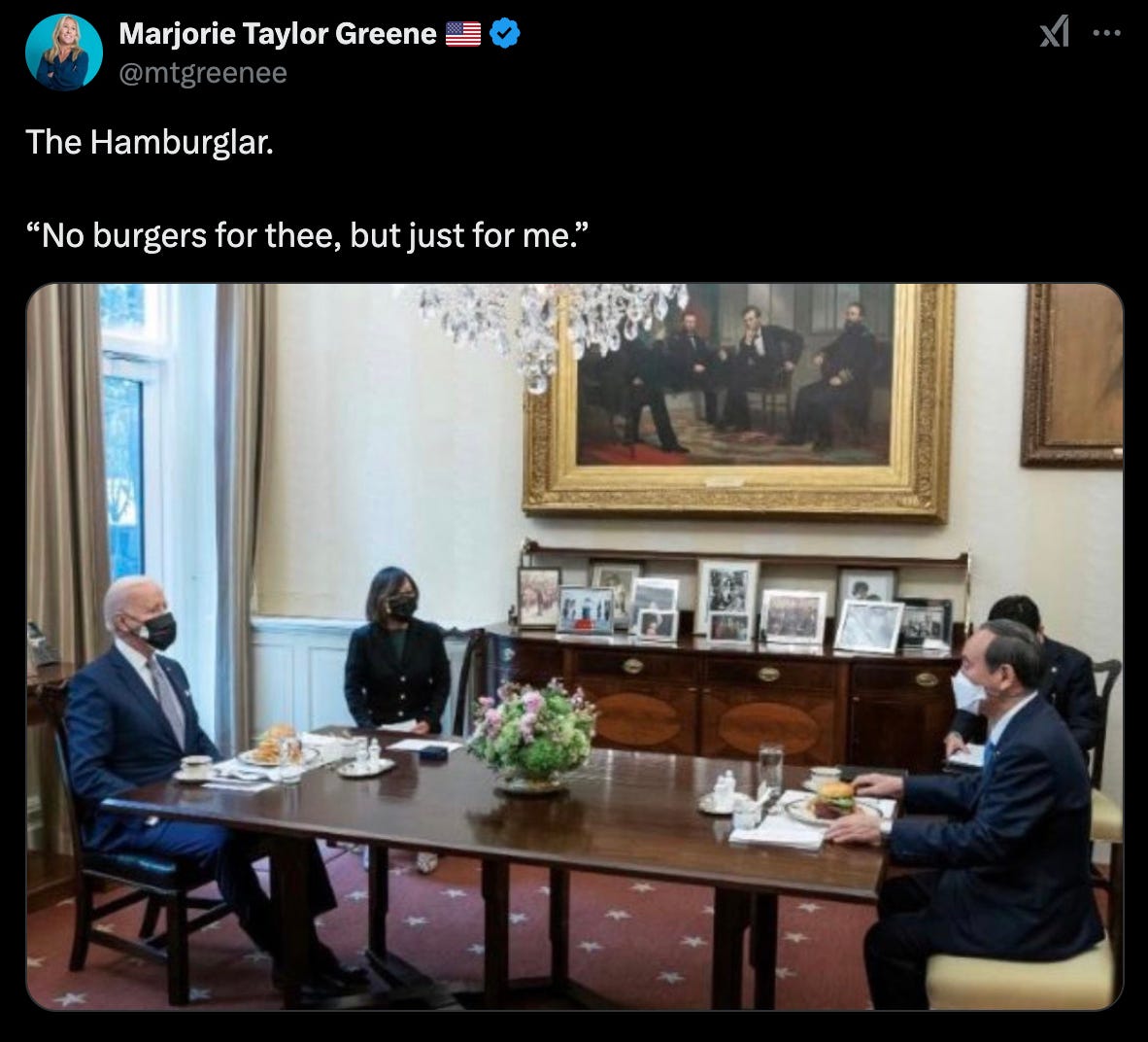 The culture war around plant-based meats. The notion that Dems are trying to take people’s meat away has been a common attack by MAGA against liberals. Back in 2021, Rep. Lauren Boebert warned that progressives were planning to ration red meat and said the government should “stay out of my kitchen.” Rep. Marjorie Taylor Greene (R-Ga.) accused Joe Biden of trying to take people’s burgers away and anointed him “The Hamburglar.”