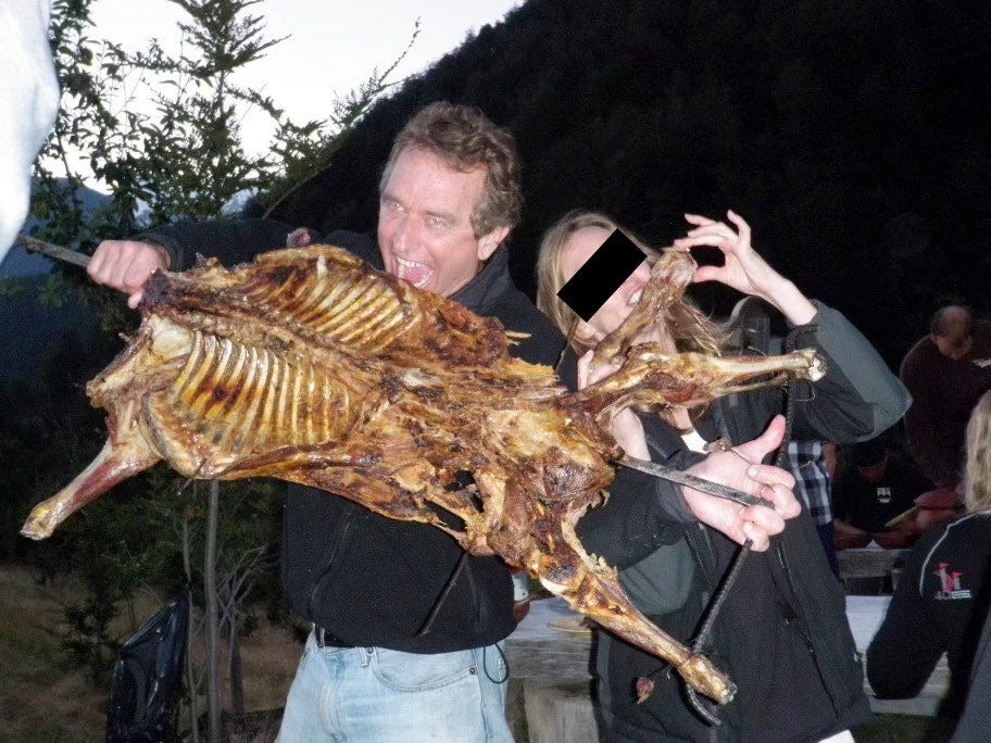 Last year, RFK Jr. shared a photo of himself eating a dog. He sent his friend a text message with a photo of a barbecued body on a spit. While metadata apparently showed the image was taken in Korea, where dogs have historically been killed and eaten by the millions, RFK Jr. later claimed the animal was actually a goat in Patagonia. What’s not in dispute, however, is that RFK Jr. thought it was funny to send his friend, an apparent animal lover, a photo of him joyfully biting into a nearly-intact corpse.