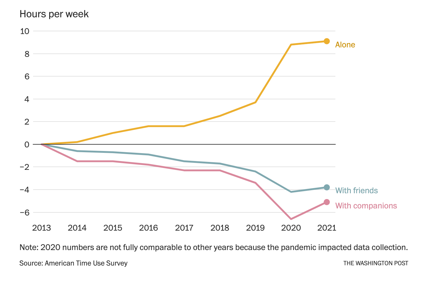Part of the reason for the surge in mental health issues is skyrocketing loneliness, which is the second cautionary lesson. Human beings are social animals, and a compelling body of research shows that loneliness is as deadly as smoking 18 cigarettes a day. Yet data from the last year shows that, even before COVID-19, loneliness was becoming a way of life for too many. Take, for example, the Washington Post’s data on how our social time has changed in the last 10 years: