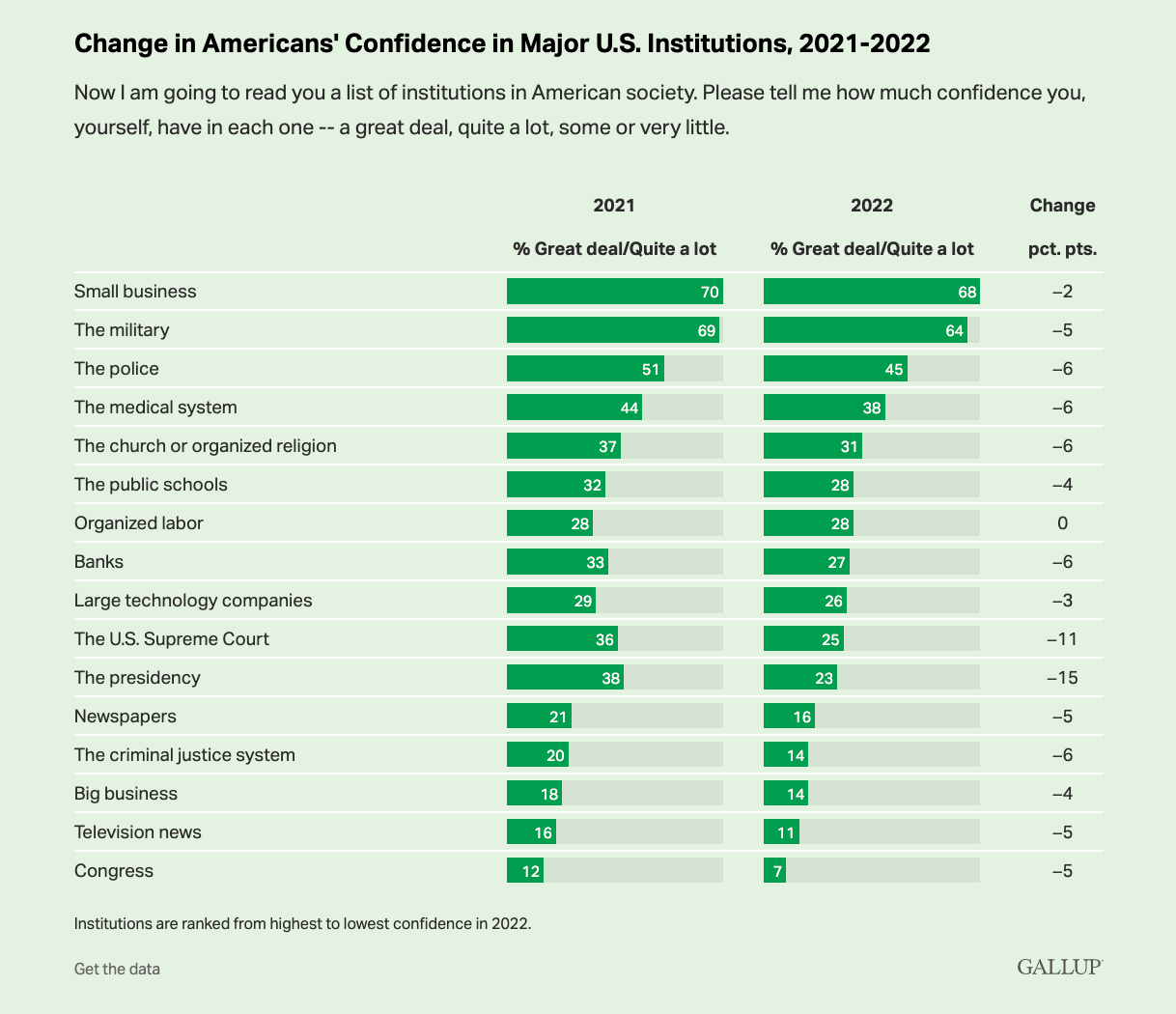 The most damaging impact of loneliness, however, is a decline in trust, which is the third lesson of 2022. A disconnected people is a distrustful people. And, perhaps for the first time in history, every institution in American life has experienced a measured decrease in trust. We don’t trust the police (after George Floyd) or the federal government (after Trump). But we don’t trust schools, small businesses, or hospitals, either.