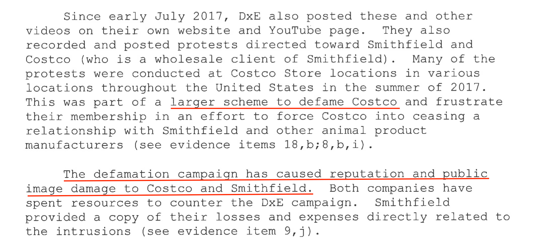 And surprisingly, the authorities don’t even hide their motivations in bringing the criminal cases against rescuers. Many of the documents used to formally charge us, such as Prosecution Summary created by the FBI in the Smithfield case, show that the government is concerned about speech, not theft. In that summary, the FBI complains about defamatory protests and public image damage — but almost nothing at all about the actual “property” that was removed. But, of course, even if we defamed Big Ag, or damaged its public image, that is not a crime.