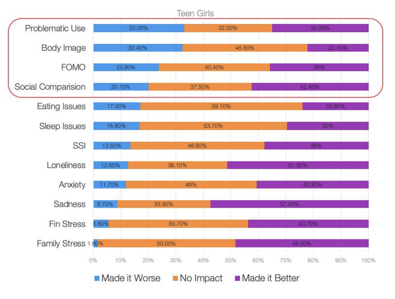 For one, the WSJ and other media stories fail to point out that, while it’s true that 32% of young girls say that Instagram made them feel worse about their body, 22% said that Instagram made them feel better and 45% said it had no impact at all. (See the second line of the chart above.) These data points were left completely out of the story, which could have had an alternative headline: “Vast majority of young girls say that Instagram has no impact or helps them with body image issues.”